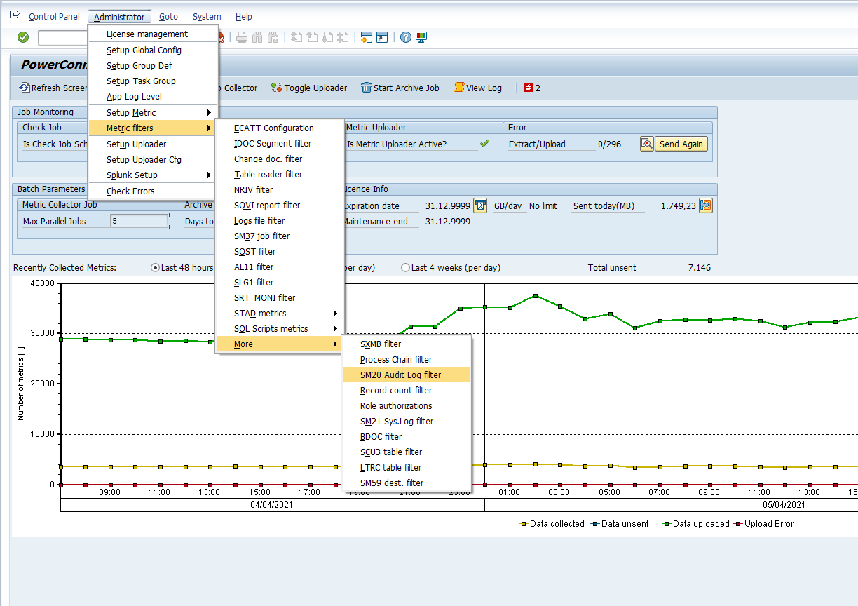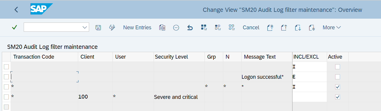 This filter is used to select or exclude specific messages from the audit log and is an optional configuration to control data volume sent to Splunk. To access the metric filter log into the managed system and execute the /n/bnwvs/main transaction. Then go to Administrator → Metric Filters → More → SM20 Audit log filter.